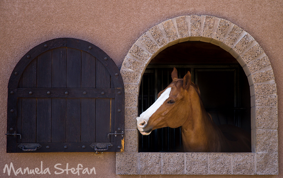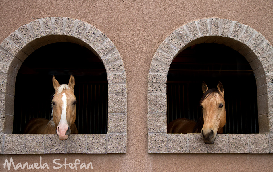 My recent trip to Arizona would have not been the same without an absolutely dreamy encounter with some local horses. While in Scottsdale I discovered a ranch with quite unique architecture, displaying intricate elements of Arabic inspiration. Quite impressive! They allow visitors so spending time admiring the horses they keep there was effortless.I still recall the peaceful, hot Friday afternoon. The horses were all inside and it seemed that I may have missed the morning bath ritual some were going through. I recall being a bit disappointed and thinking I may leave without the chance of capturing anything…Just when I was getting ready to drive away I saw them…two beautiful animals sticking their majestic heads through the rounded windows…and so “The Window Series” came to life. I am grateful.